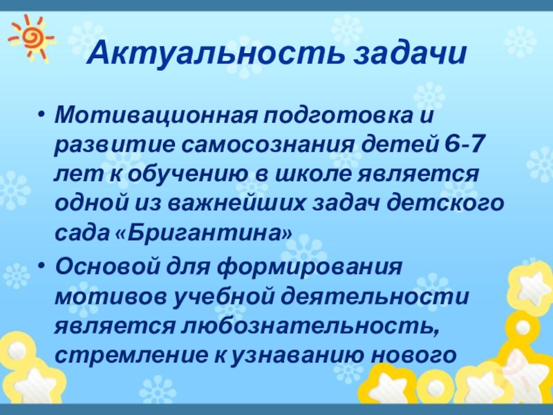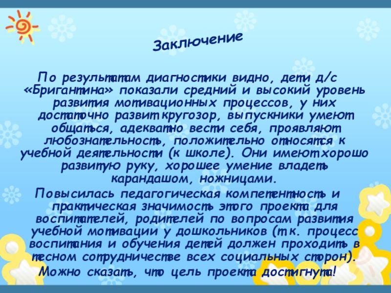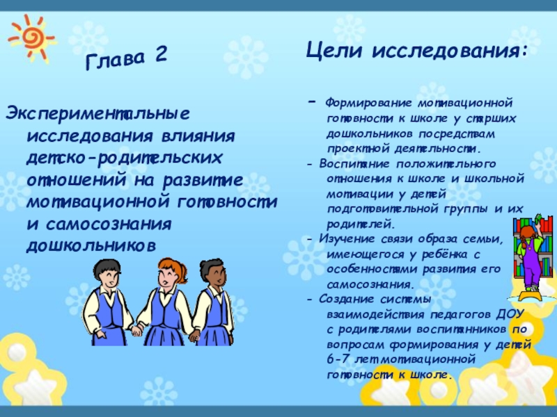 - Создание системы взаимодействия педагогов ДОУ с родителями воспитанников по вопросам формирования у детей 6-7 лет мотивационной готовности к школе.