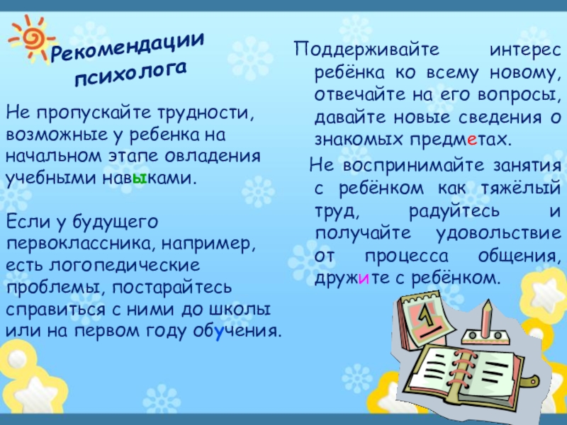 Не воспринимайте занятия с ребёнком как тяжёлый труд, радуйтесь и получайте удовольствие от процесса общения, дружите с ребёнком.