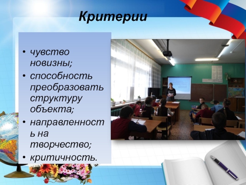 Критерии чувство новизны;способность преобразовать структуру объекта;направленность на творчество;критичность.