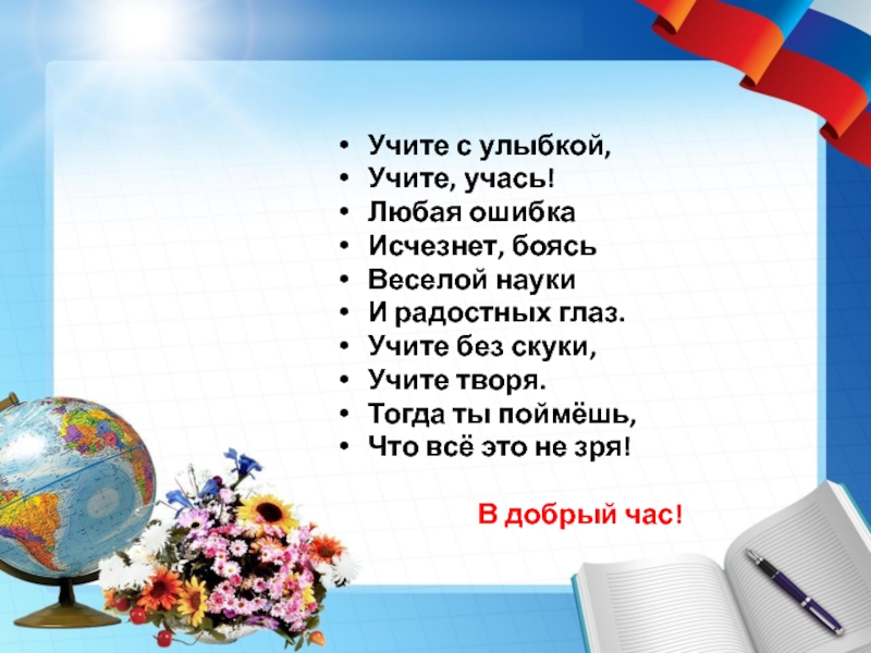Учите с улыбкой, Учите, учась!Любая ошибкаИсчезнет, боясьВеселой наукиИ радостных глаз.Учите без скуки,Учите творя.Тогда ты поймёшь,Что всё это