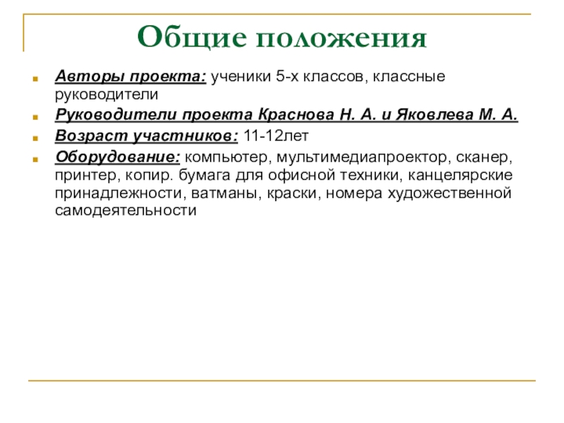 Оборудование: компьютер, мультимедиапроектор, сканер, принтер, копир. бумага для офисной техники, канцелярские принадлежности, ватманы, краски, номера художественной самодеятельности