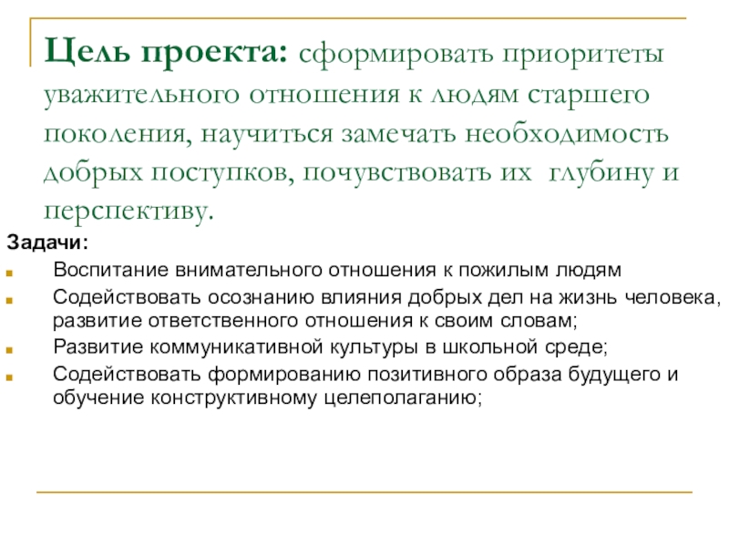 Слайд 6Цель проекта: сформировать приоритеты уважительного отношения к людям старшего поколения, научиться замечать