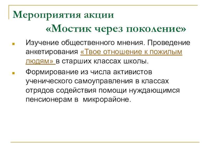 общественного мнения. Проведение анкетирования «Твое отношение к пожилым людям» в старших классах школы.