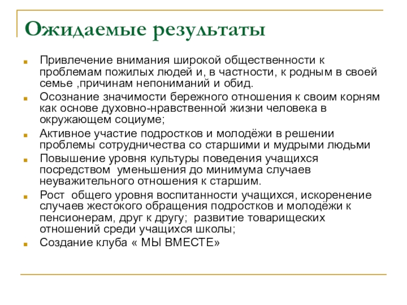 Рост общего уровня воспитанности учащихся, искоренение случаев жестокого обращения подростков и молодёжи к пенсионерам, друг к другу; развитие товарищеских отношений среди учащихся школы;