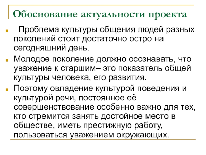 Поэтому овладение культурой поведения и культурой речи, постоянное её совершенствование особенно важно для тех, кто стремится занять достойное место в обществе, иметь престижную работу, пользоваться уважением окружающих.