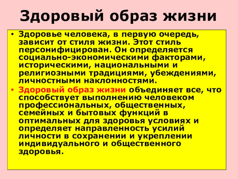 Здоровый образ жизни объединяет все, что способствует выполнению человеком профессиональных, общественных, семейных и бытовых функций в оптимальных для здоровья условиях и определяет направленность усилий личности в сохранении и укреплении индивидуального и общественного здоровья.