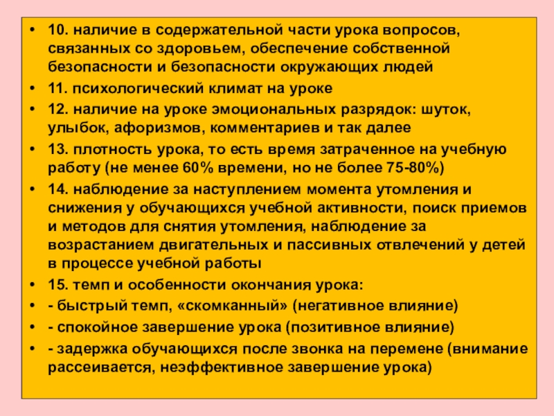 13. плотность урока, то есть время затраченное на учебную работу (не менее 60% времени, но не более 75-80%)