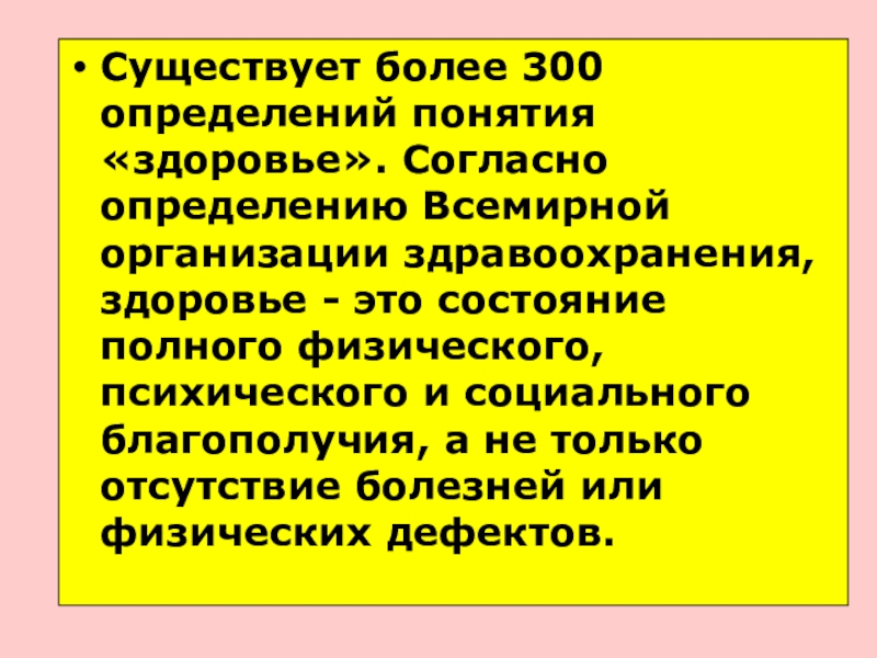 Слайд 2Существует более 300 определений понятия «здоровье». Согласно определению Всемирной организации здравоохранения,