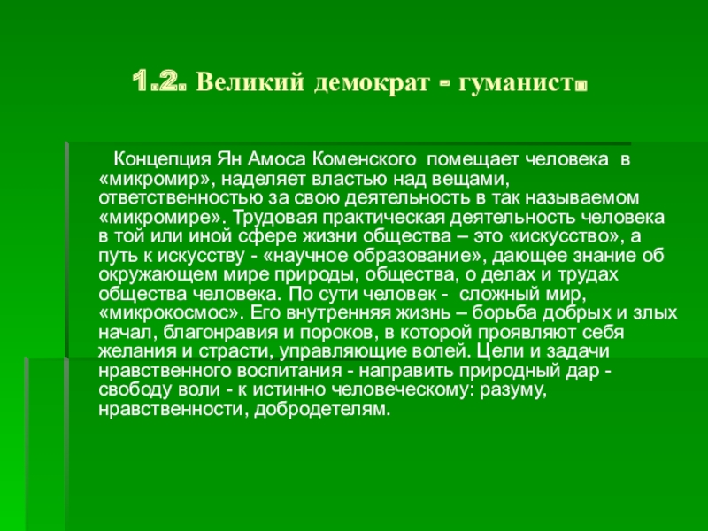 Концепция Ян Амоса Коменского помещает человека в «микромир», наделяет властью над вещами, ответственностью за свою деятельность в так называемом «микромире». Трудовая практическая деятельность человека в той или иной сфере жизни общества – это «искусство», а путь к искусству - «научное образование», дающее знание об окружающем мире природы, общества, о делах и трудах общества человека. По сути человек - сложный мир, «микрокосмос». Его внутренняя жизнь – борьба добрых и злых начал, благонравия и пороков, в которой проявляют себя желания и страсти, управляющие волей. Цели и задачи нравственного воспитания - направить природный дар - свободу воли - к истинно человеческому: разуму, нравственности, добродетелям.