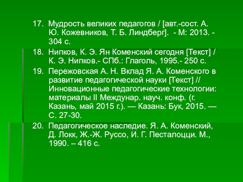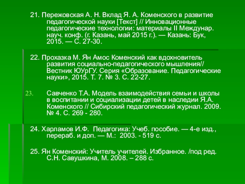 19. Пережовская А. Н. Вклад Я. А. Коменского в развитие педагогической науки [Текст] // Инновационные педагогические технологии: материалы II Междунар. науч. конф. (г. Казань, май 2015 г.). — Казань: Бук, 2015. — С. 27-30.