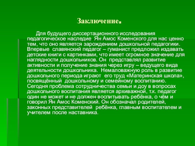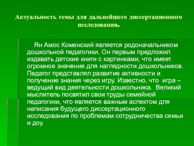 Коменский является родоначальником дошкольной педагогики. Он первым предложил издавать детские книги с картинками, что имеет огромное значение для наглядности дошкольников. Педагог представлял развитие активности и получение знания через игру. Известно, что игра – ведущий вид деятельности дошкольника. Великий мыслитель посвятил свои труды семейной педагогики, что является важным аспектом для написания будущего диссертационного исследования по проблемам сотрудничества семьи и доу.