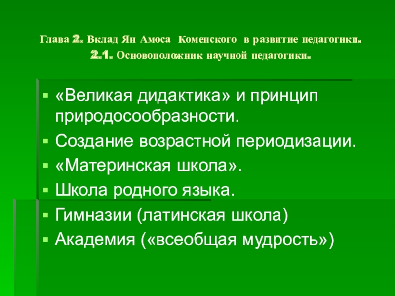 Слайд 11Глава 2. Вклад Ян Амоса Коменского в развитие педагогики.