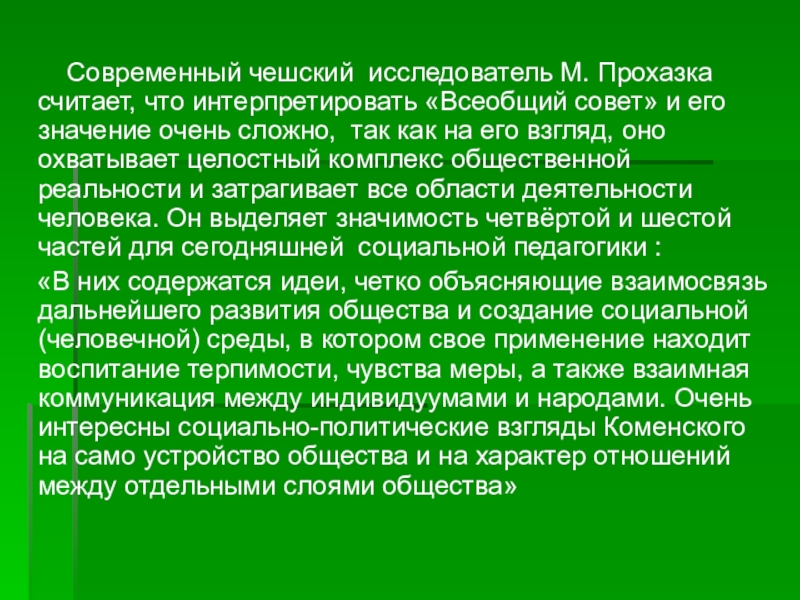 «В них содержатся идеи, четко объясняющие взаимосвязь дальнейшего развития общества и создание социальной (человечной) среды, в котором свое применение находит воспитание терпимости, чувства меры, а также взаимная коммуникация между индивидуумами и народами. Очень интересны социально-политические взгляды Коменского на само устройство общества и на характер отношений между отдельными слоями общества»