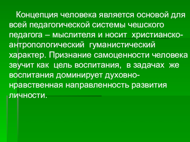 чешского педагога – мыслителя и носит христианско-антропологический гуманистический характер. Признание самоценности человека звучит как цель воспитания, в задачах же воспитания доминирует духовно-нравственная направленность развития личности.