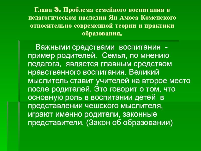 Слайд 13Глава 3. Проблема семейного воспитания в педагогическом наследии Ян Амоса Коменского