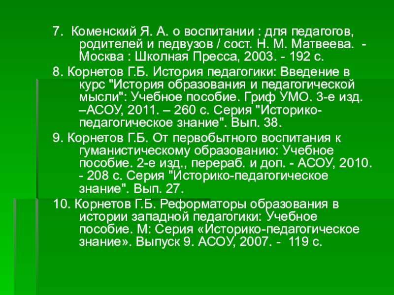 8. Корнетов Г.Б. История педагогики: Введение в курс "История образования и педагогической мысли": Учебное пособие. Гриф УМО. 3-е изд. –АСОУ, 2011. – 260 с. Серия "Историко-педагогическое знание". Вып. 38.