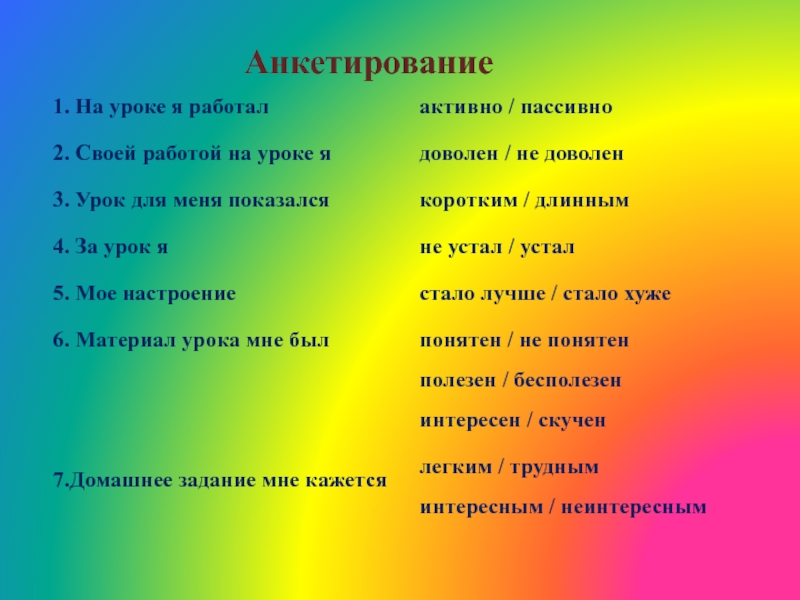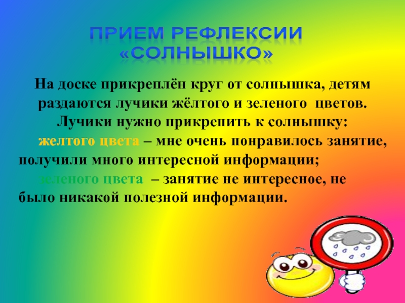 желтого цвета – мне очень понравилось занятие, получили много интересной информации;