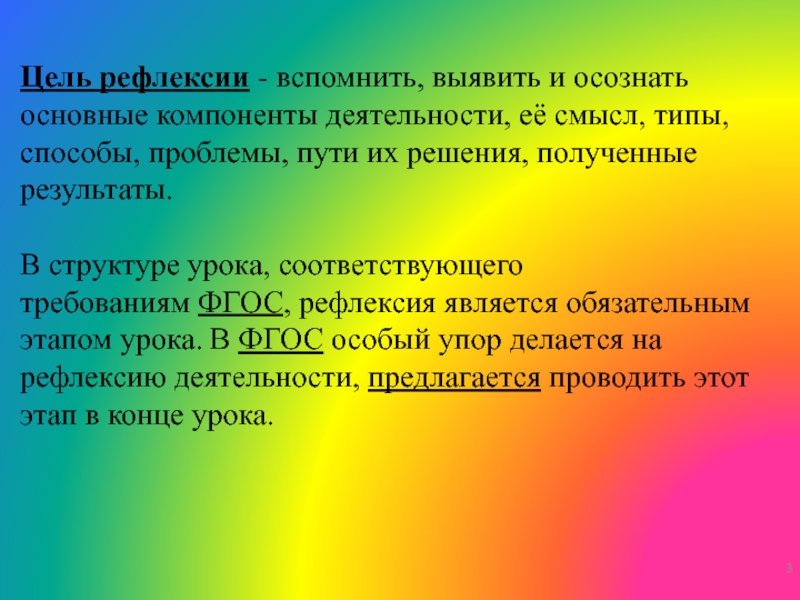 Цель рефлексии - вспомнить, выявить и осознать основные компоненты