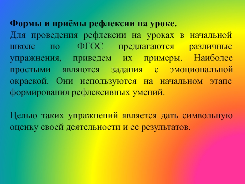 начальной школе по ФГОС предлагаются различные упражнения, приведем их примеры. Наиболее простыми являются задания с эмоциональной окраской. Они используются на начальном этапе формирования рефлексивных умений.