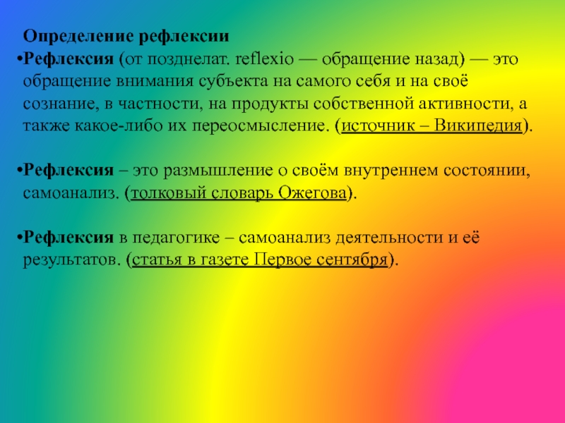 субъекта на самого себя и на своё сознание, в частности, на продукты собственной активности, а также какое-либо их переосмысление. (источник – Википедия).