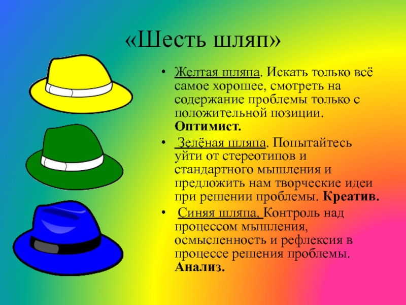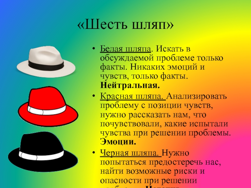 Красная шляпа. Анализировать проблему с позиции чувств, нужно рассказать нам, что почувствовали, какие испытали чувства при решении проблемы. Эмоции.