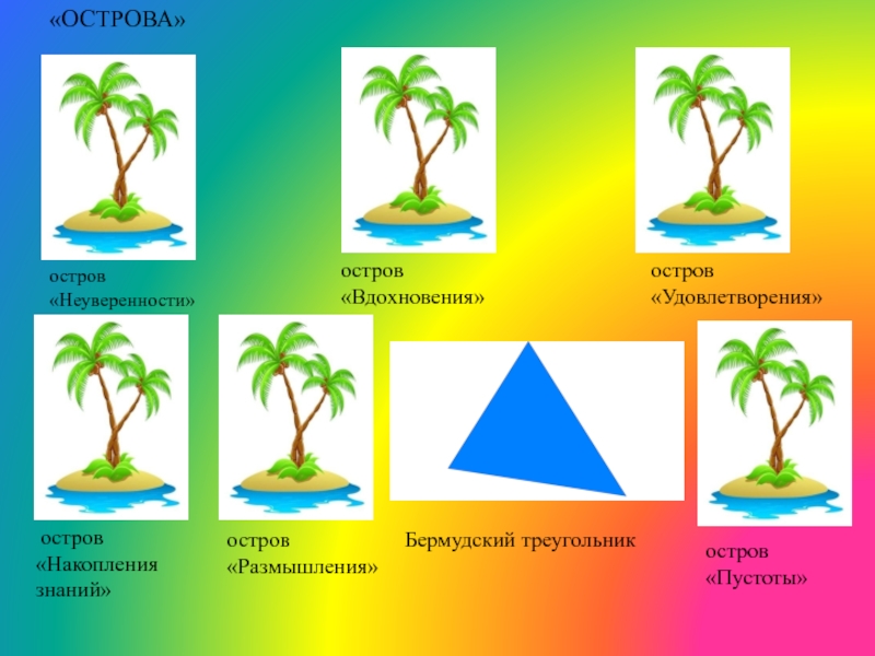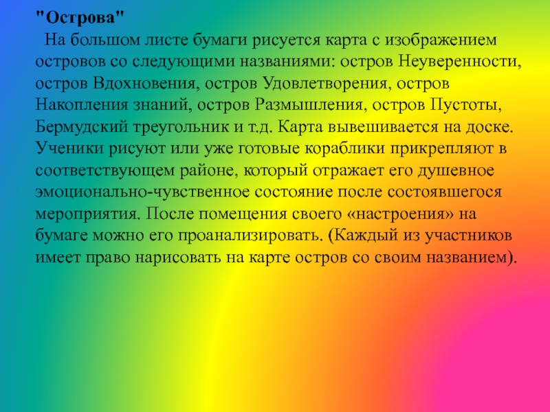 следующими названиями: остров Неуверенности, остров Вдохновения, остров Удовлетворения, остров Накопления знаний, остров Размышления, остров Пустоты, Бермудский треугольник и т.д. Карта вывешивается на доске. Ученики рисуют или уже готовые кораблики прикрепляют в соответствующем районе, который отражает его душевное эмоционально-чувственное состояние после состоявшегося мероприятия. После помещения своего «настроения» на бумаге можно его проанализировать. (Каждый из участников имеет право нарисовать на карте остров со своим названием).