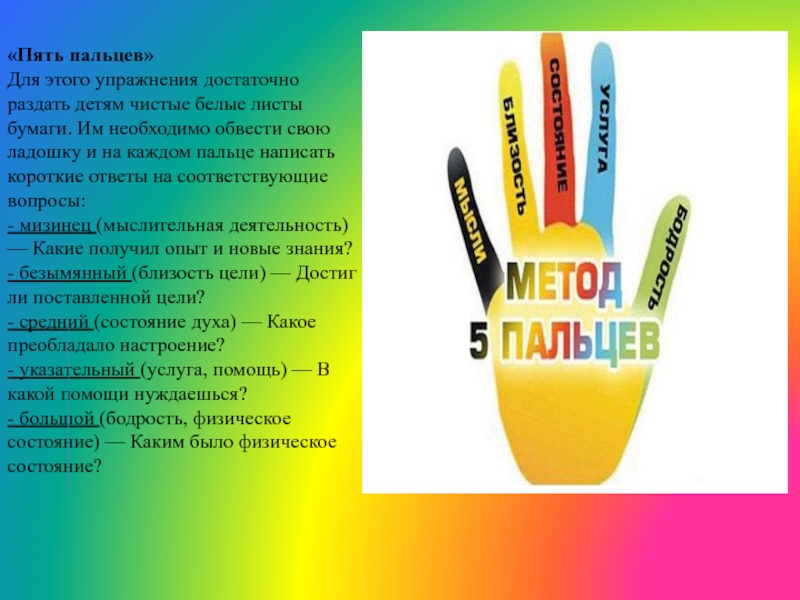 Им необходимо обвести свою ладошку и на каждом пальце написать короткие ответы на соответствующие вопросы: