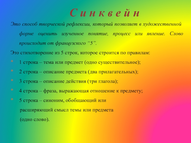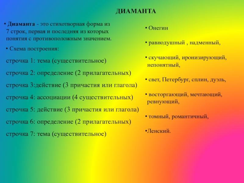 строчка 2: определение (2 прилагательных) строчка 3:действие (3 причастия или глагола)