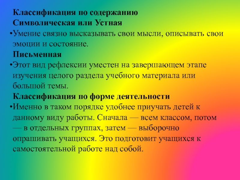 Именно в таком порядке удобнее приучать детей к данному виду работы. Сначала — всем классом, потом — в отдельных группах, затем — выборочно опрашивать учащихся. Это подготовит учащихся к самостоятельной работе над собой.