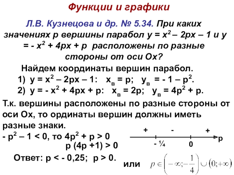 y = x2 – 2px – 1: хв = p; yв = - 1 – р2.
