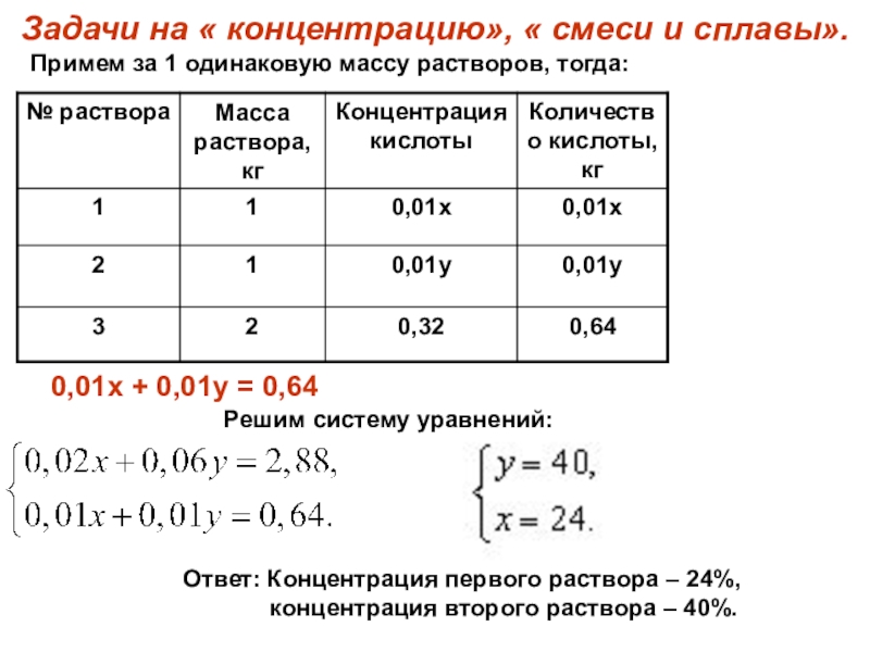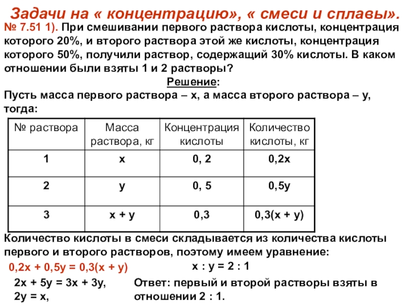 Пусть концентрация первого раствора – х%, а концентрация второго раствора – у%, тогда: