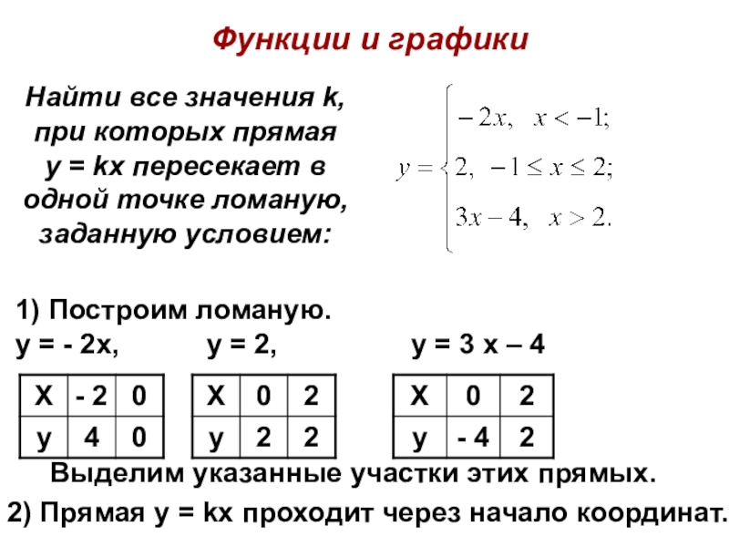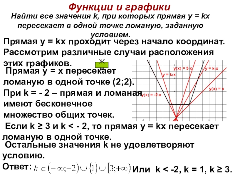 Если k ≥ 3 и k < - 2, то прямая у = kx пересекает ломаную в одной точке.