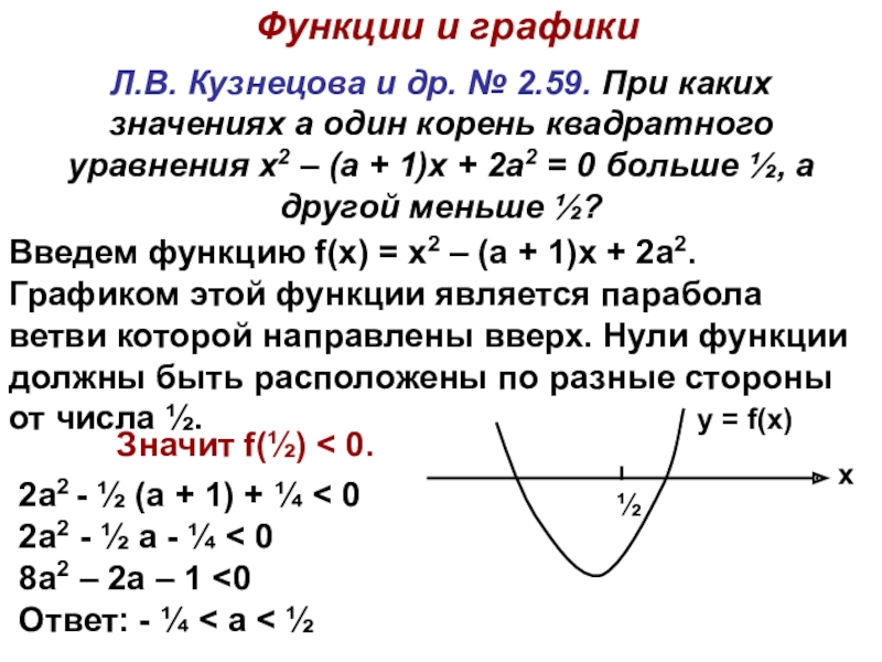 Графиком этой функции является парабола ветви которой направлены вверх. Нули функции должны быть расположены по разные стороны от числа ½.