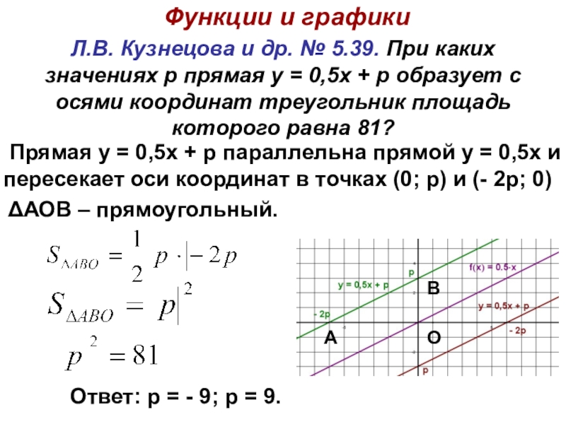 Прямая у = 0,5х + р параллельна прямой у = 0,5х и пересекает оси координат в точках (0; р) и (- 2р; 0)