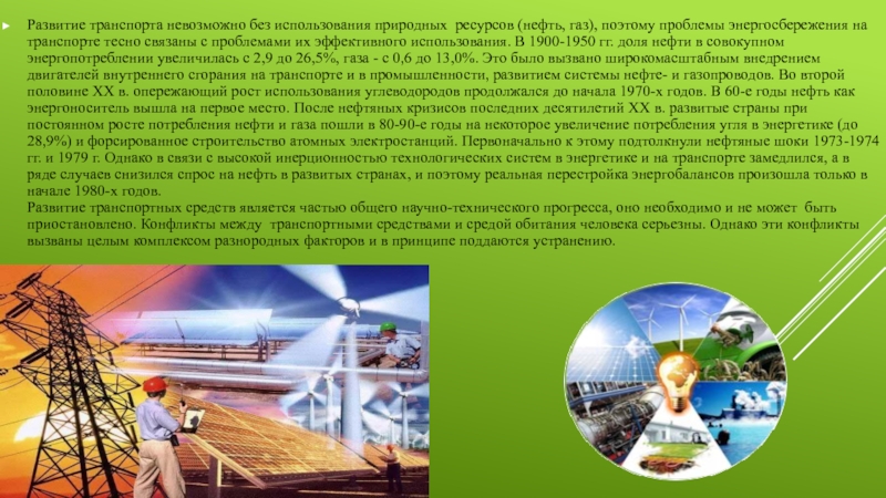 Слайд 3Развитие транспорта невозможно без использования природных ресурсов (нефть, газ), поэтому проблемы энергосбережения на транспорте тесно