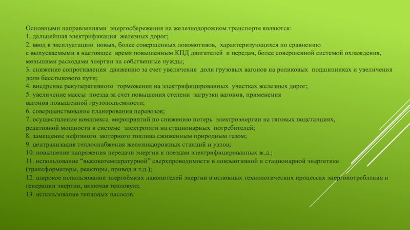 Слайд 10Основными направлениями энергосбережения на железнодорожном транспорте являются: