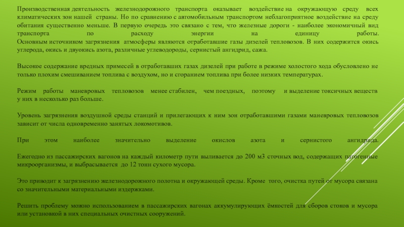 Слайд 5Производственная деятельность железнодорожного транспорта оказывает воздействие на окружающую среду всех климатических зон нашей страны. Но