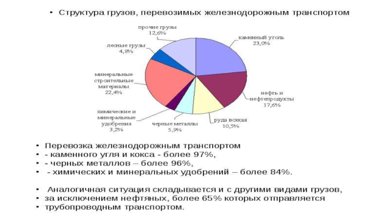 Слайд 7Железнодорожный транспорт, на долю которого приходится примерно 50% всех перевезенных в