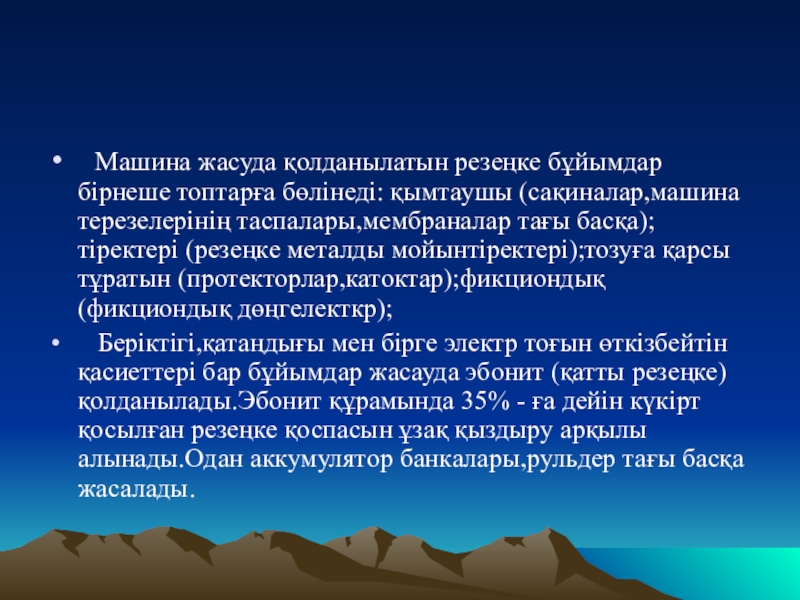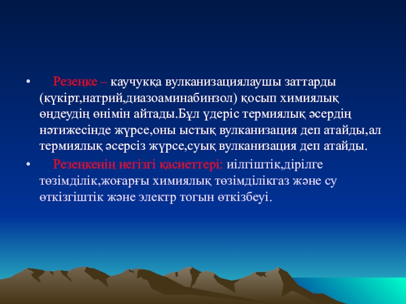 Слайд 2 Резеңке – каучукқа вулканизациялаушы заттарды (күкірт,натрий,диазоаминабинзол) қосып химиялық өңдеудің