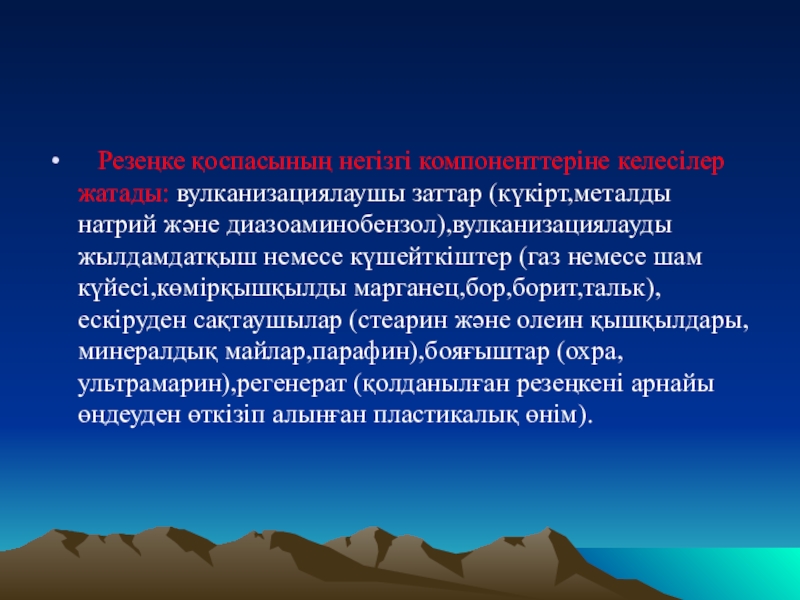 Слайд 4 Резеңке қоспасының негізгі компоненттеріне келесілер жатады: вулканизациялаушы заттар (күкірт,металды