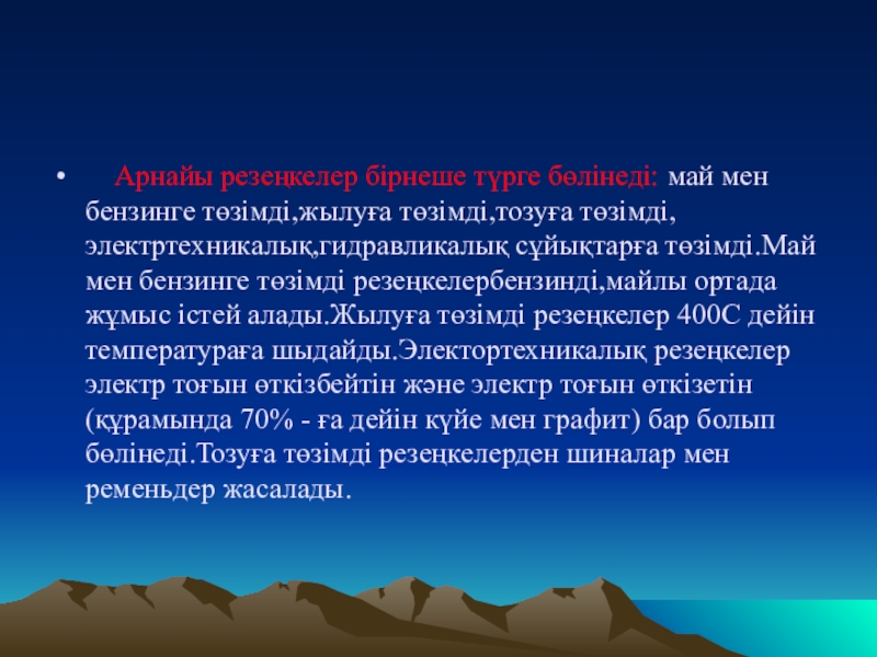 Слайд 7 Арнайы резеңкелер бірнеше түрге бөлінеді: май мен бензинге төзімді,жылуға