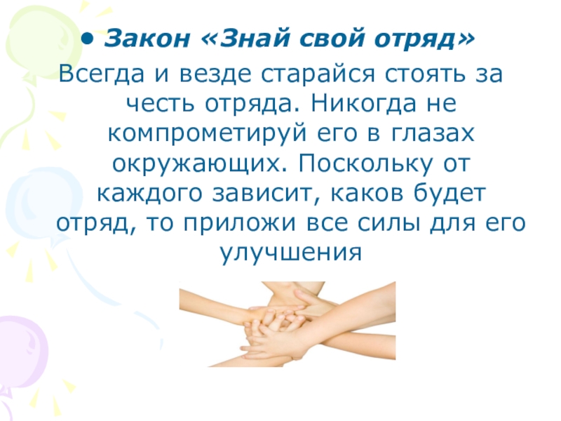 Закон «Знай свой отряд»Всегда и везде старайся стоять за честь отряда. Никогда не компрометируй его в глазах