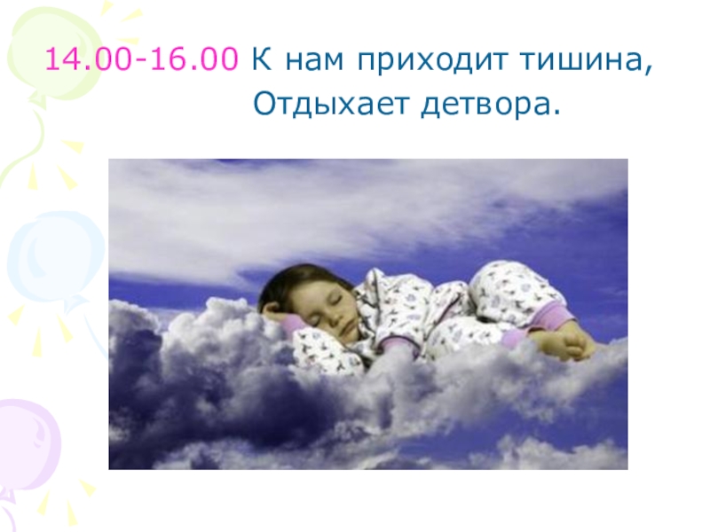 14.00-16.00 К нам приходит тишина,          Отдыхает детвора.