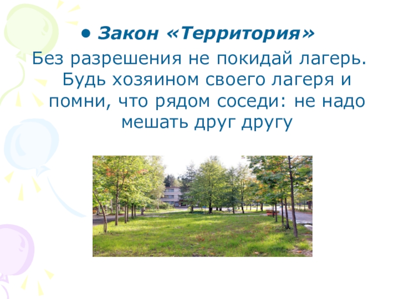 Закон «Территория»Без разрешения не покидай лагерь. Будь хозяином своего лагеря и помни, что рядом соседи: не надо