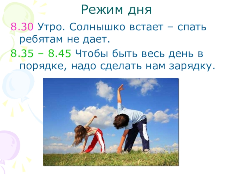 Режим дня8.30 Утро. Солнышко встает – спать ребятам не дает.8.35 – 8.45 Чтобы быть весь день в