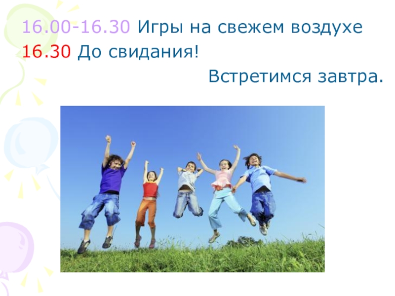 16.00-16.30 Игры на свежем воздухе16.30 До свидания! Встретимся завтра.
