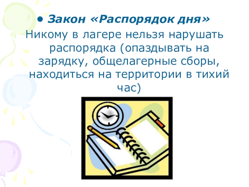 Закон «Распорядок дня»Никому в лагере нельзя нарушать распорядка (опаздывать на зарядку, общелагерные сборы, находиться на территории в
