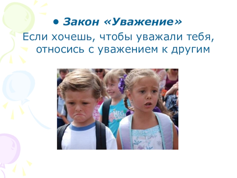 Закон «Уважение»Если хочешь, чтобы уважали тебя, относись с уважением к другим