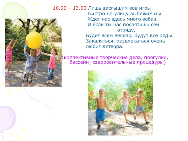 Слайд 510.00 – 13.00 Лишь заслышим зов игры,
