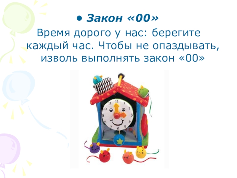 Закон «00»Время дорого у нас: берегите каждый час. Чтобы не опаздывать, изволь выполнять закон «00»